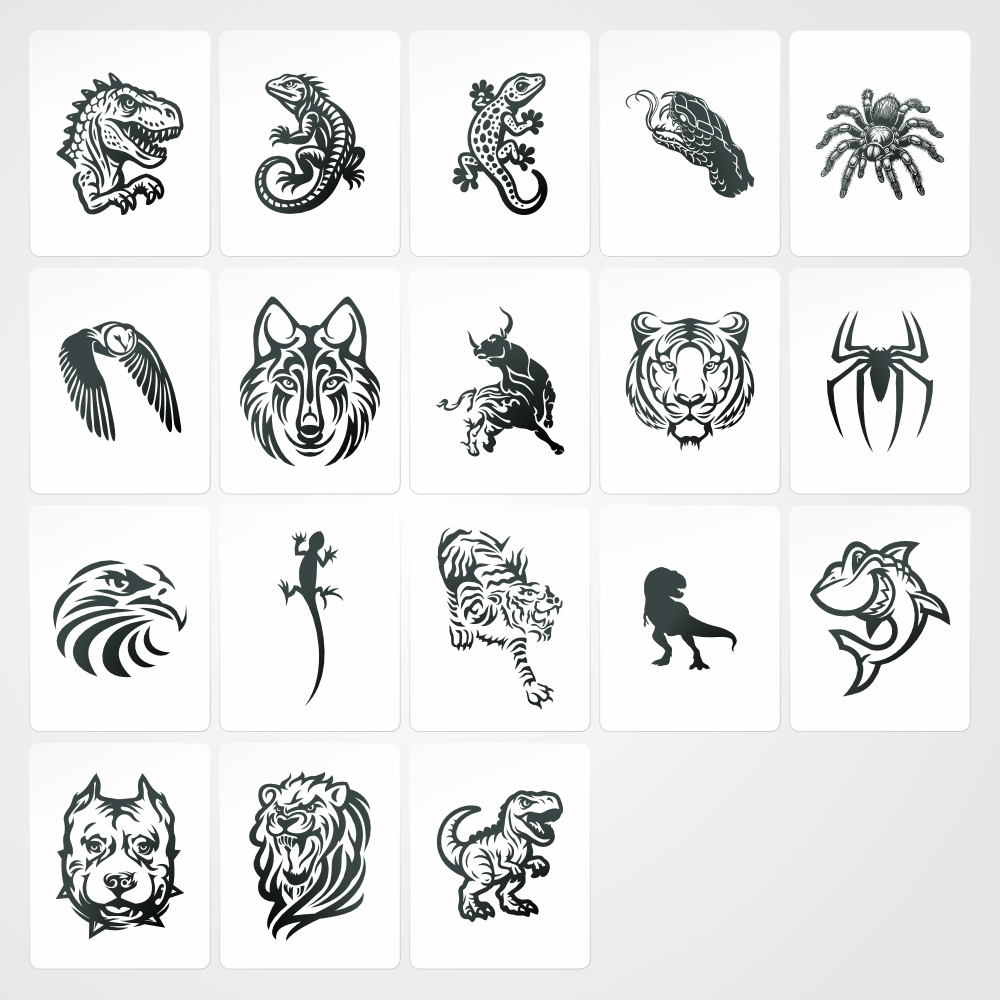 A large, diverse set of animal-themed designs: tigers, wolves, lizards, spiders, dinosaurs, birds of prey, fish, bulls, lions and more. Strong, dynamic and expressive graphics perfect for anyone who enjoys bold and energetic motifs.