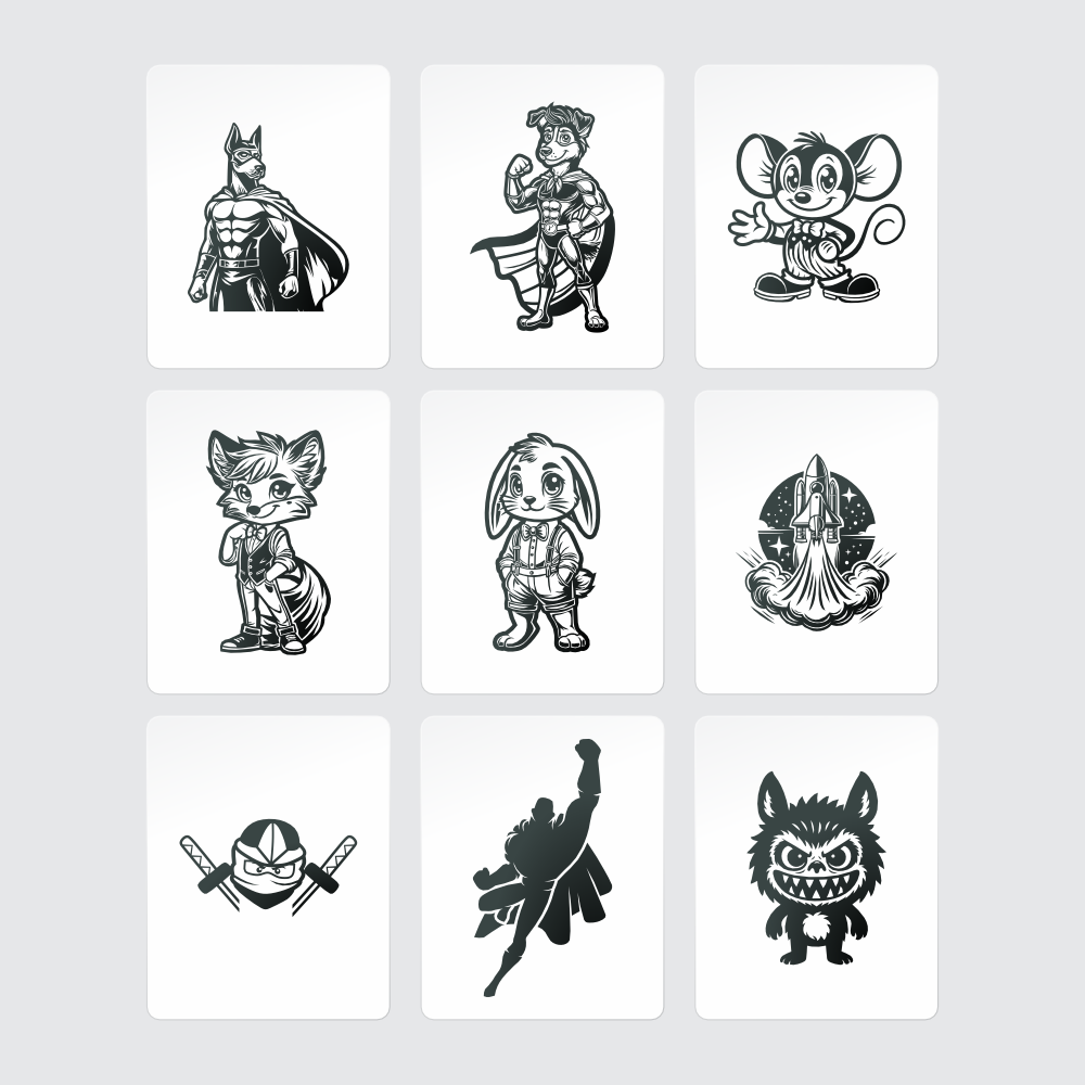 A set full of lively, fairy-tale characters: animal superheroes, adorable heroes in costumes, a space rocket and a playful little monster. Perfect for kids who love action, fantasy and creative adventures.