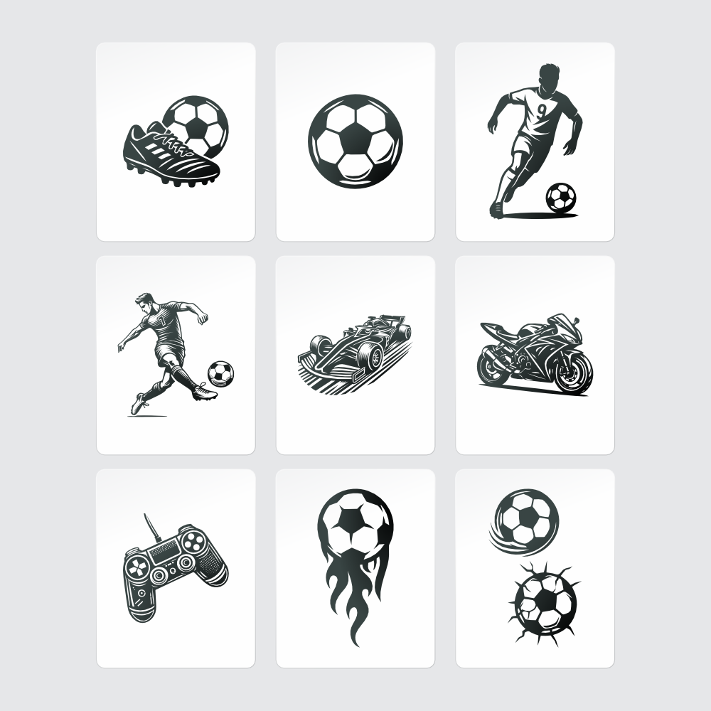 A high-energy set featuring sports-themed designs: football players, footballs, dynamic action scenes, a racing car, a motorcycle and a gamepad for e-sport lovers. Perfect for sports events, camps, animations or everyday fun.