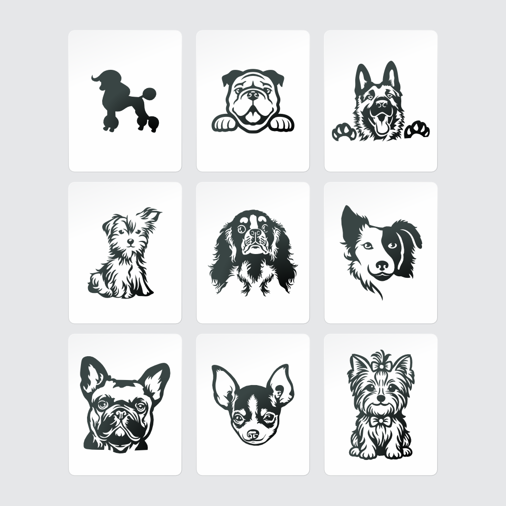 - The QTPQT5 pack includes nine dog designs featuring various breeds such as poodle, bulldog, shepherd, yorkie, spaniel and chihuahua. Perfect for all dog lovers.