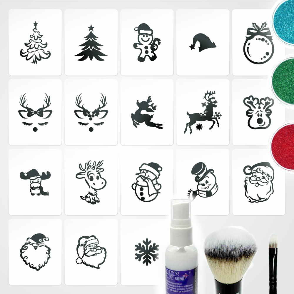 - The QT7 set includes 18 Christmas designs: trees, Santa, reindeer, snowmen, gingerbread figures and winter motifs. Contains 3 glitters (blue, green, red), 2 brushes and the “+” prep spray.