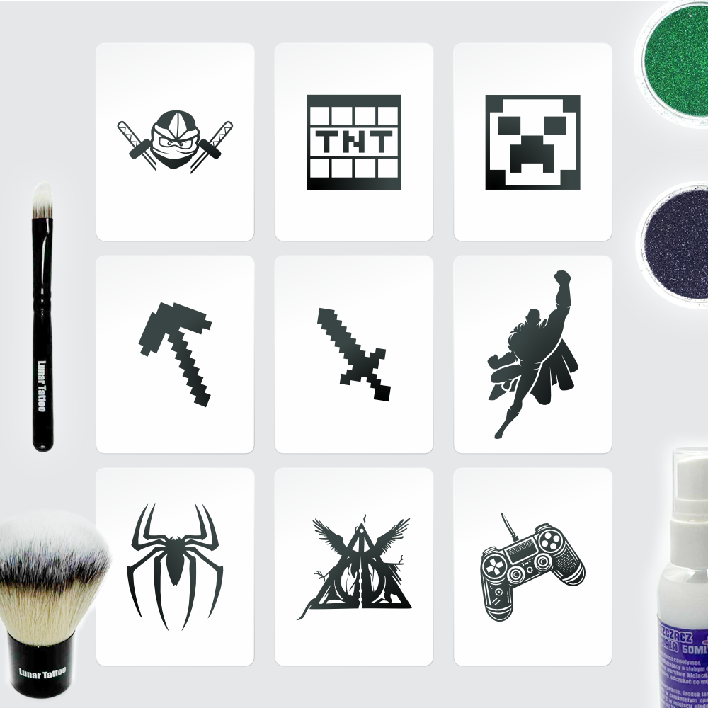 A perfect set for gamers and action fans! It includes 9 dynamic designs: a ninja with swords, TNT block, creeper face, pixel pickaxe and sword, hero silhouette, spider, campfire symbol and a classic controller.