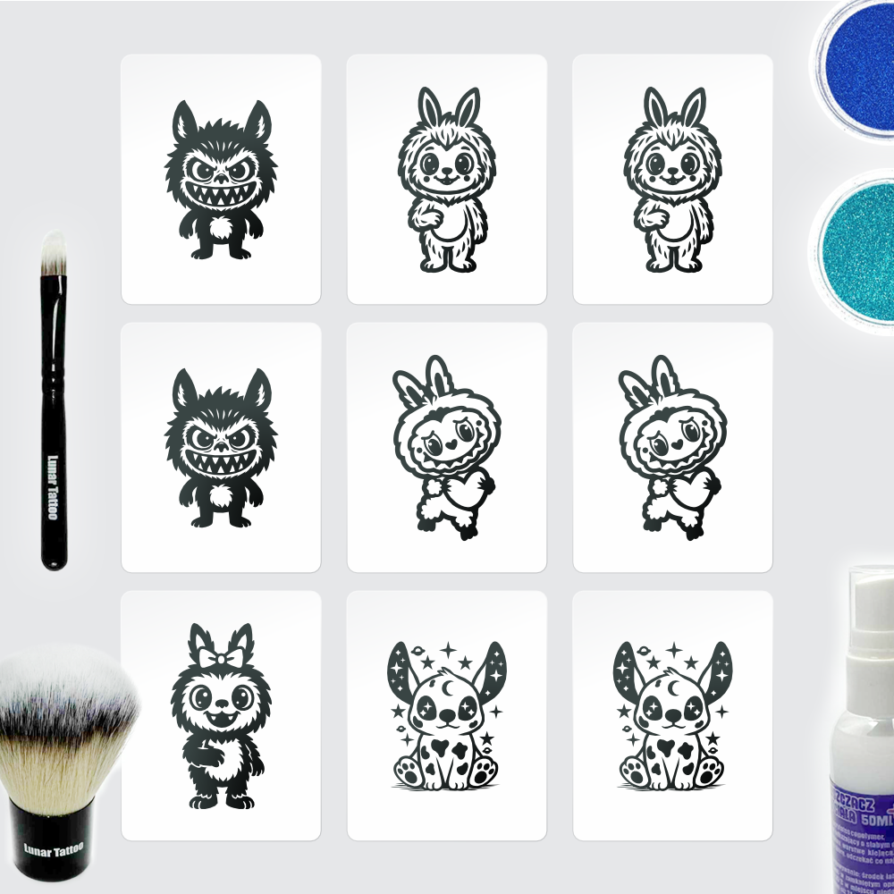 - The QT6 set contains funny creature designs: cute, silly and crazy little monsters. Includes 9 designs, 2 glitters (blue, turquoise), 2 brushes and the “+” prep spray.