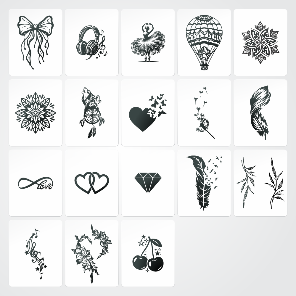 Duży pakiet pełen dekoracyjnych i eleganckich motywów symbolicznych: mandale, serca, pióra, motywy muzyczne, baletnica, balon, roślinne akcenty oraz delikatne wzory minimalistyczne. Idealny wybór dla osób ceniących estetyczne, subtelne i ponadczasowe tatuaże.