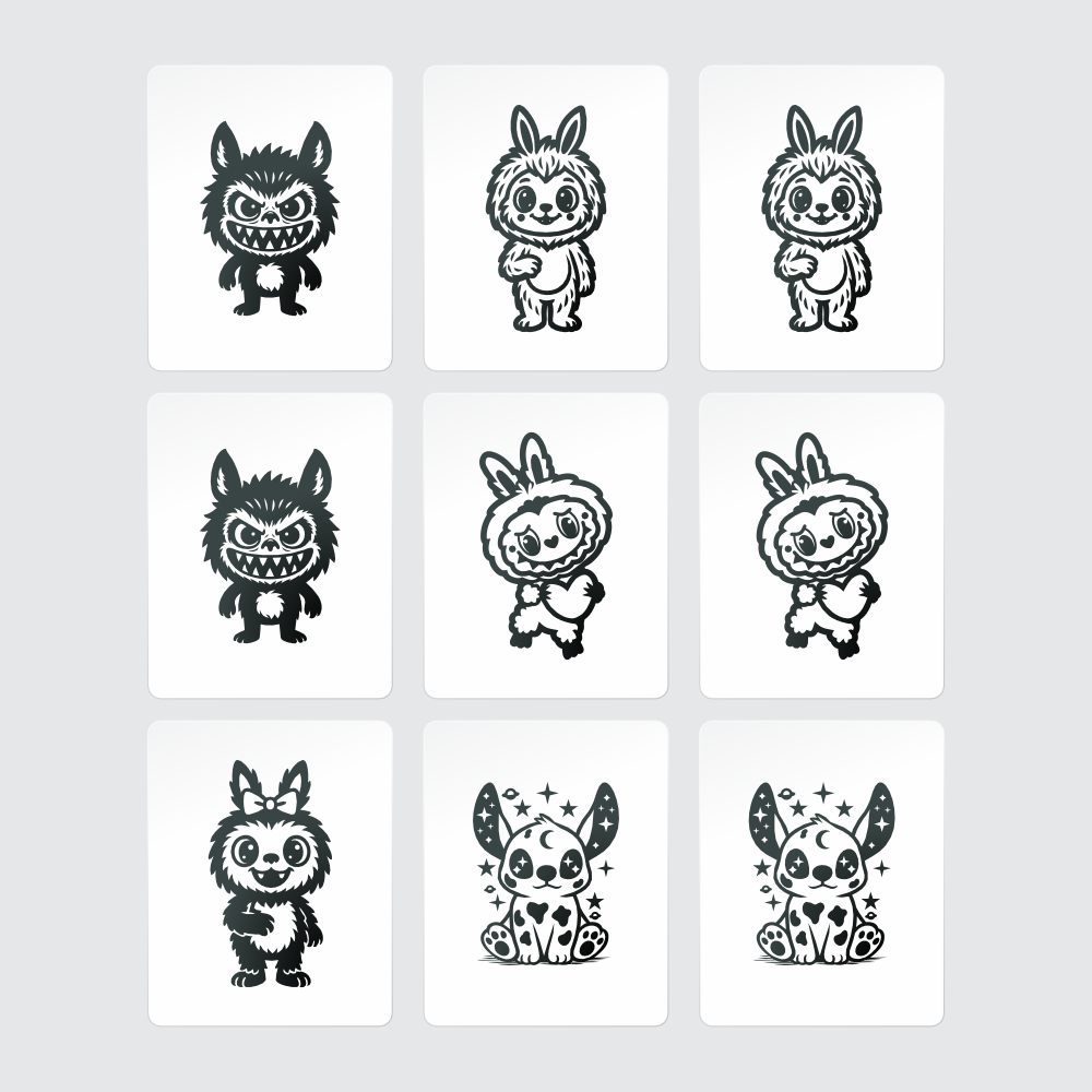 Wesoły zestaw pełen zabawnych stworków: groźnych z wyglądu, ale komicznych potworków, futrzastych przyjaciół z długimi uszami oraz słodkich postaci o dużych oczach. Pakiet idealny dla dzieci, które uwielbiają bajkowe klimaty, humor i kreatywną zabawę.